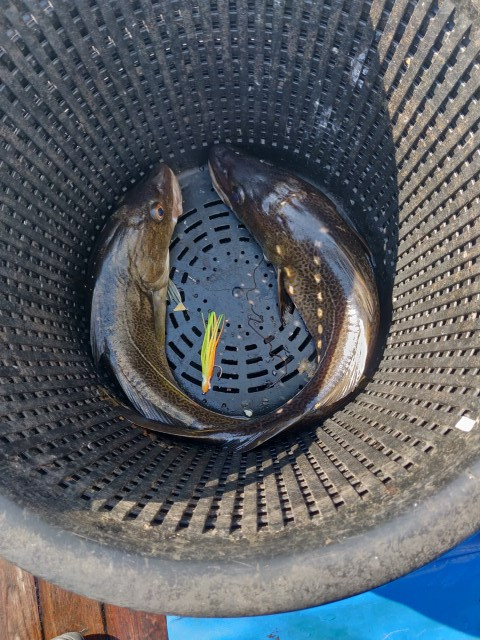 Forventningsfulde gjorde vi klar, og mon ikke om skipper fandt fisk. Det var ikke alle der fik, men fisk kom der. Selv fik jeg to torsk op, hvor den ene blev genudsat.