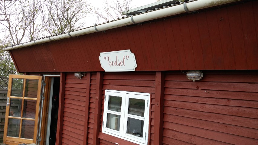 Godset er bortset fra manglen på el og vand, et super hus. Her er alt fra sofa, spisebord, 4 køjepladser, til en stor terrasse med direkte fiskeadgang til Sneum Å.