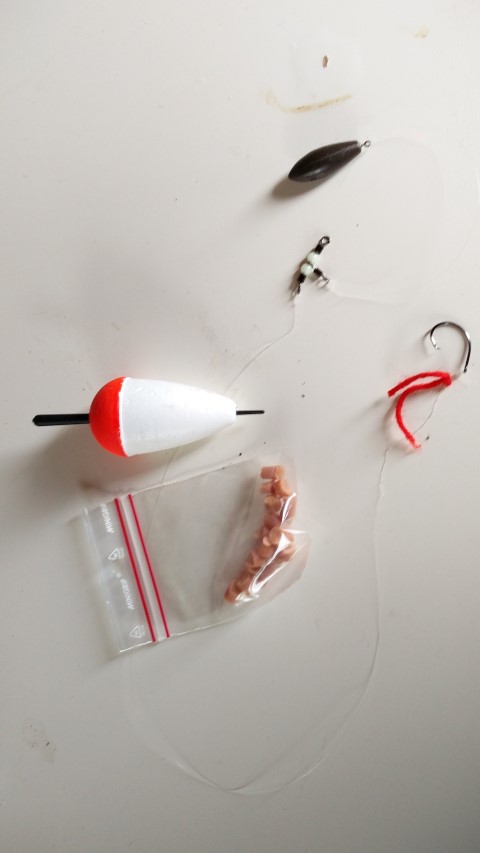 Esben havde udstyret os med et flåd og et rig til at fiske med. Rigget var bygget op med en 3-svirvel, som gik fra hovedlinen med flådet på, og ud i to liner. Den ene (korte) line endte i et lod, og den anden (lange) endte i en cirkelkrog monteret med masser af regnorm og et stykke rødt bomulds snor.