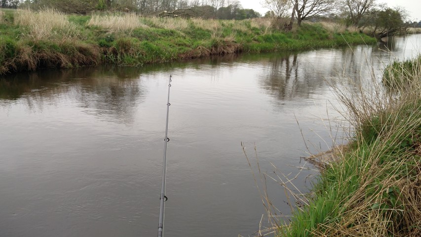 Efter godt en times fiskeri fik jeg en kontakt, flådet sank langsomt flere gange og tog pludselig et ryk på en meters penge. Jeg ventede spændt, og kunne pludselig se den blanke side af en laks i vandet. Jeg ventede lidt mere, men der skete ikke mere, i stedet begyndte flådet igen at flyde med strømmen. Jeg hev rigget op af vandet, og konstaterede at ormen var væk. Efter at have sat ny orm på gik jeg et stykke tilbage i langs åen, og prøvede at fiske samme sted igen, det gjorde jeg nogle gange uden held, og besluttede derfor at forsætte ned langs åen.