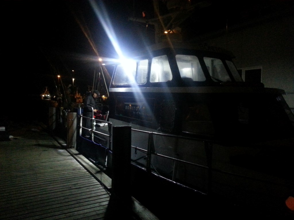 Fremme ved båden Bonito på Hanstholm havn kl. 5.00 fik vi fundet os et par gode pladser, der var afgang kl. 6.00, men vi var ikke de første på båden så der var lidt kamp om pladserne. Vi valgte et par pladser bagerst på båden, da jeg havde læst at stod man forrest så fik man vand, og det viste sig at være helt rigtigt.