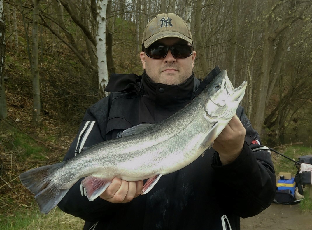 Med en start på fiskeriet kl. 6.30, så virkede det som en ørkenvandring før jeg fik dagens først fisk. Lige omkring kl. 9.30 skiftede jeg igen over til min sort gule gennemløber, efter at have fisket med bombarda og powerbait i et par timer, og før det lidt med gennemløber. Det gav i første kast et godt hug som udløste en fed fight. Allerede mens fisken var i vandet bemærkede Grumpy fiskens utrolig flotte finner, og som du kan se på billedet så er de virkelig flotte. Fisken i sig selv skulle også sig at være rigtig flot, og ikke mindst anderledes. Det viste sig nemlig at være en rigtig flot kildeørred på 2,20 kg som havde taget min gennemløber.