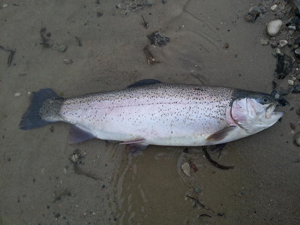 Med fisk på krogen kom der endelig lidt gang i den, det var dejligt at mærke fisken fighte. Den tog nogle gode udløb, og var bestemt ikke klar til at komme op ad vandet. Men heldigvis for mig så vandt jeg fighten, og fik en flot blank regnbueørred på 2.10 kg på land.